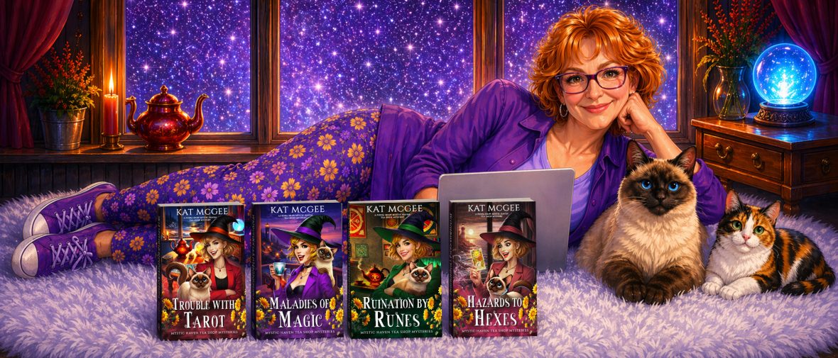 Amidst the playful antics of her furry friends, Kat weaves tales that blend mystery and humor, all amid the sweet scent of honeysuckle and the soft glow of fireflies. As she crafts her stories with a glass of sweet iced tea within reach, her dog dozes at her feet and her cat keeps a watchful eye from atop a nearby bookshelf, overseeing the skitter of words on the screen.